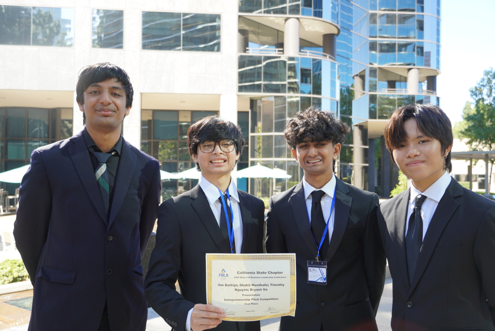 Above: Om Bathija, Shakil Musthafa, Timothy Nguyen and Bryant Vo won first place in the entrepreneur pitch category.